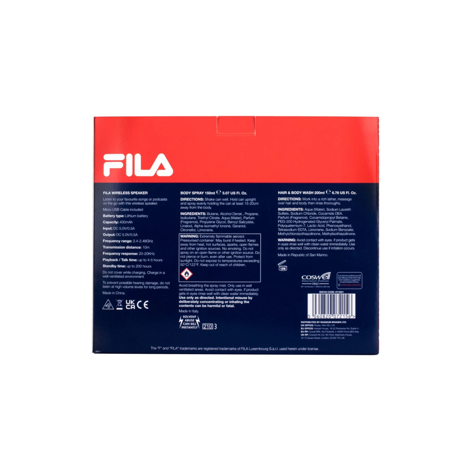200ml FILA Hair & Body Wash 150ml FILA Deodorant FILA Wireless Bluetooth Speaker – Lithium Battery (Micro USB Cable Included) –Â Standby time: 200hrs